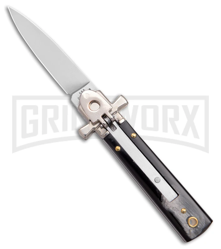 This 6″ Dominus Leverlock Stiletto has a horn handle and a satin stainless steel bayonet blade.