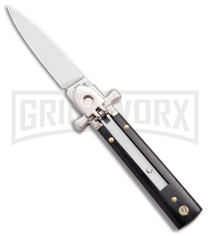 The AGA Mini Classic lever lock from Italy shows beautiful workmanship & style. This version sports a dark horn handle and a satin finished blade. Press the lever down and the knife opens automatically, then press again to release the blade and fold it closed. This is an excellent piece to begin or add to your Italian collection.