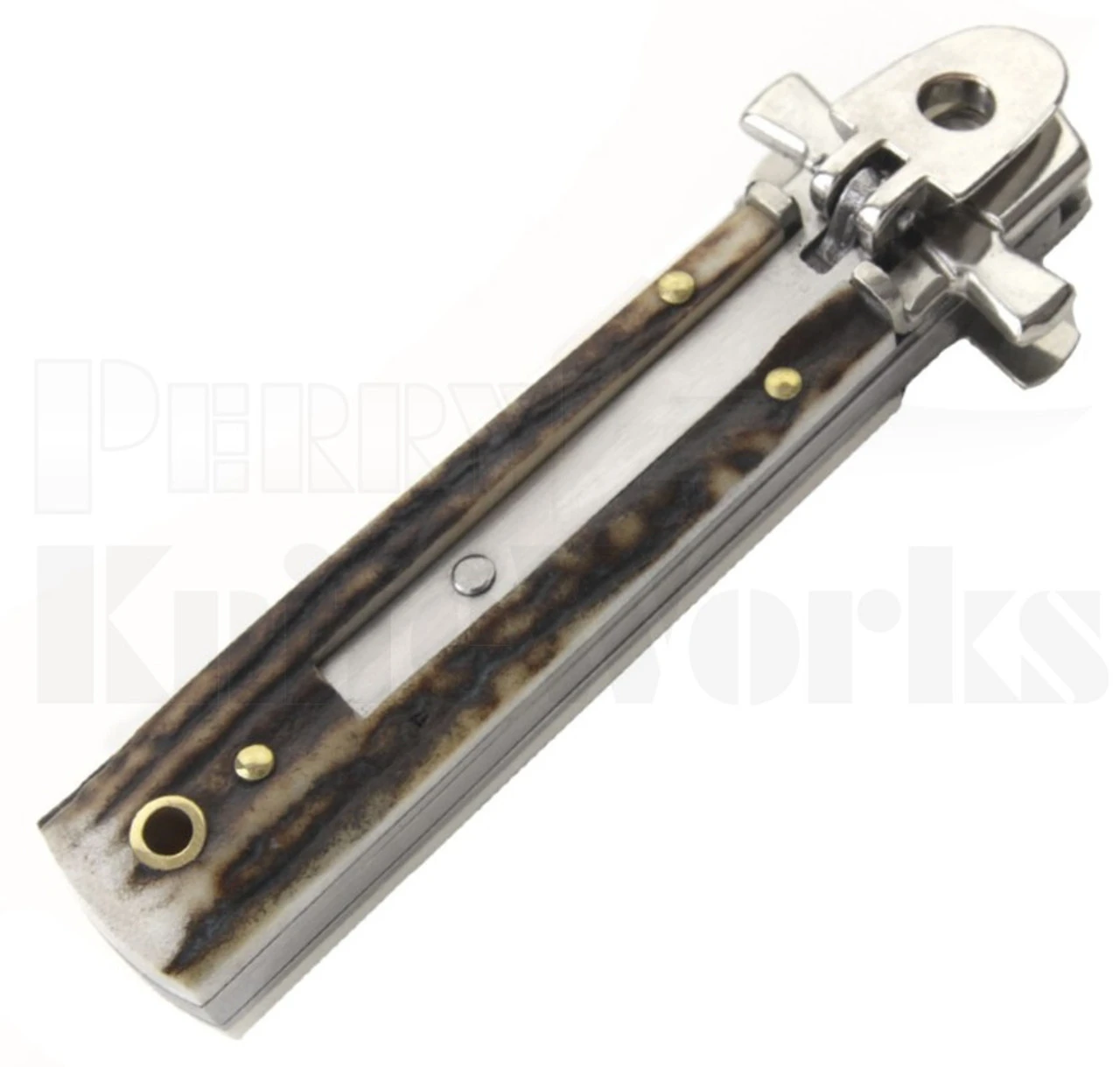 This AGA 6” Dominus Italian Stiletto comes in the leverlock style with a genuine stag horn handle and a polished blade. AGA Campolin makes some of the finest Italian stilettos on the market and this Dominus is a prime example of their craftsmanship. Brass pins add a classic finishing touch to the piece. Experience the collectible Italian quality of these authentic stilettos from AGA Campolin. *By purchasing this knife you are agreeing to our terms & conditions*
