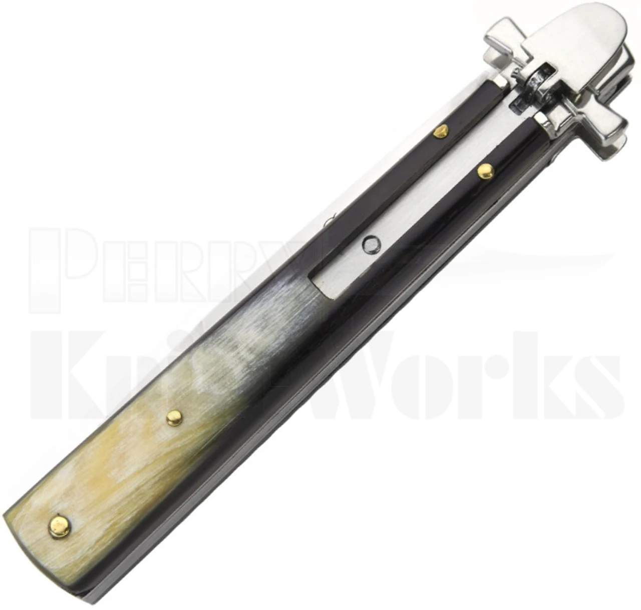 This AGA 9″ Dominus Italian Stiletto comes in the leverlock style with a genuine horn handle and a satin finished blade. AGA Campolin makes some of the finest Italian stilettos on the market and this Dominus is a prime example of their craftsmanship. Brass pins add a classic finishing touch to the piece. Experience the collectible Italian quality of these authentic stilettos from AGA Campolin. *By purchasing this knife you are agreeing to our terms & conditions*