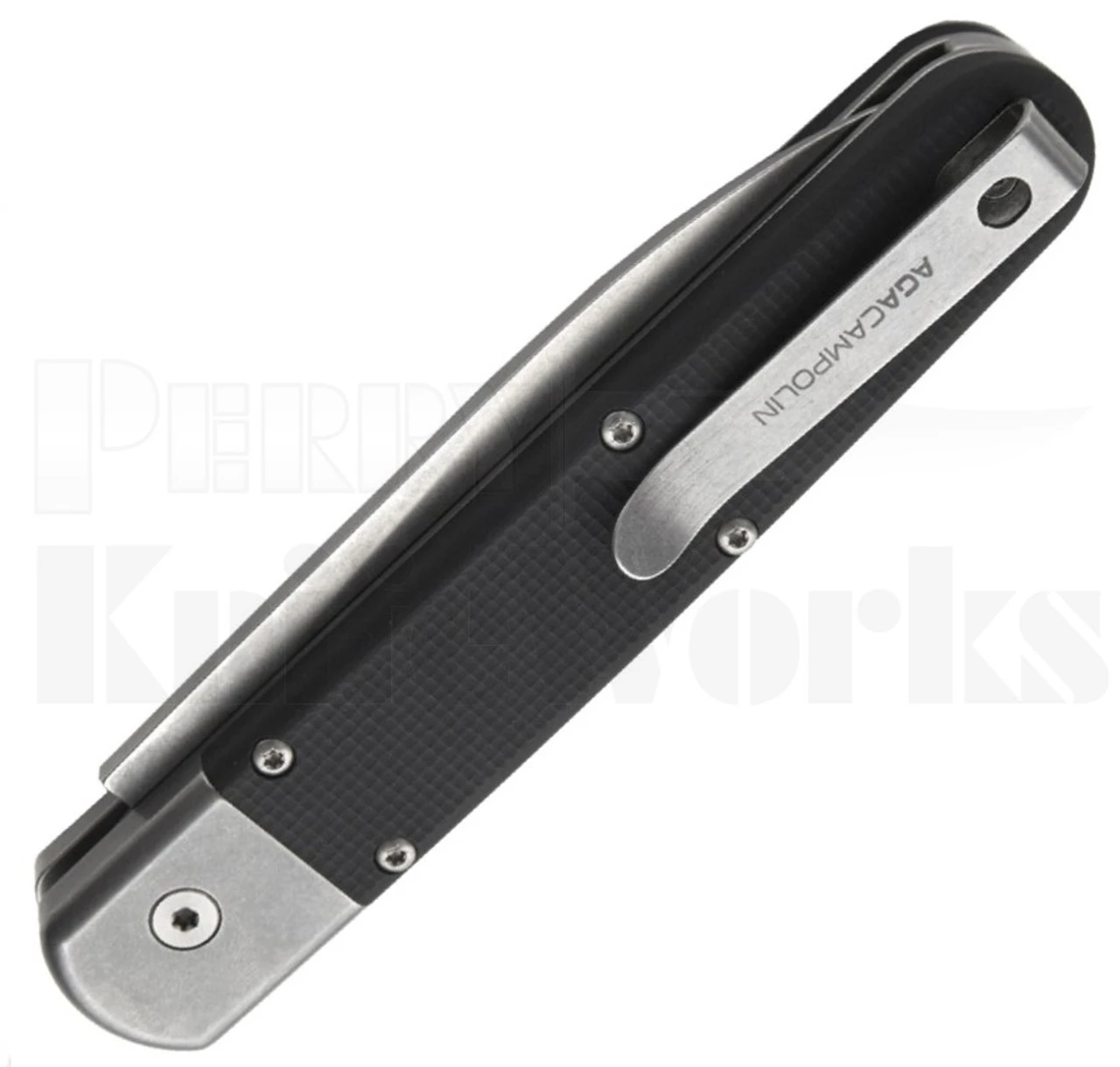 The AGA Campolin the Baron Elite is an automatic knife that is the modern evolution of the Baron build with the same leverlock mechanism like the successful “Zero”. It has N690Co stainless steel drop point blade with a stonewash finish and solid stonewashed AISI 420 steel liners and bolsters. The double spring gives faster action and guarantees longer durability where the inverted lever ensures quick opening action. The handle is made of black G-10 with a 3d texture for a better grip and comes with a stainless steel pocket clip. The springs are very easy to replace and the Baron Elite comes with an extra spring in the carbon paper box.  *By purchasing this knife you are agreeing to our terms & conditions*