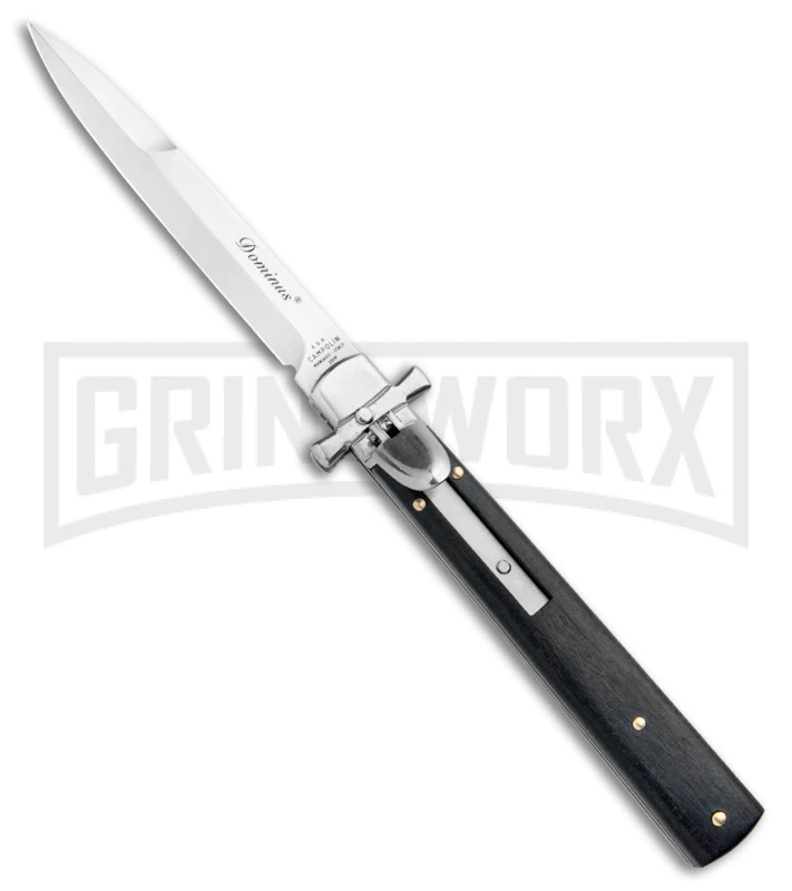 This 9″ Dominus Lever lock Stiletto has an ebony handle and a polished stainless steel bayonet blade.