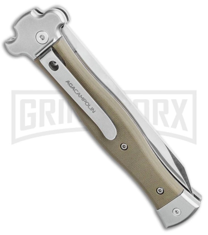 AGA Campolin really hit this one out of the park with a flawless fit and finish, snappy automatic deployment, and rock solid blade lock up. The blade is made from Austrian N690co steel with a plain edge and a satin finish. Item includes a tip-down pocket clip.